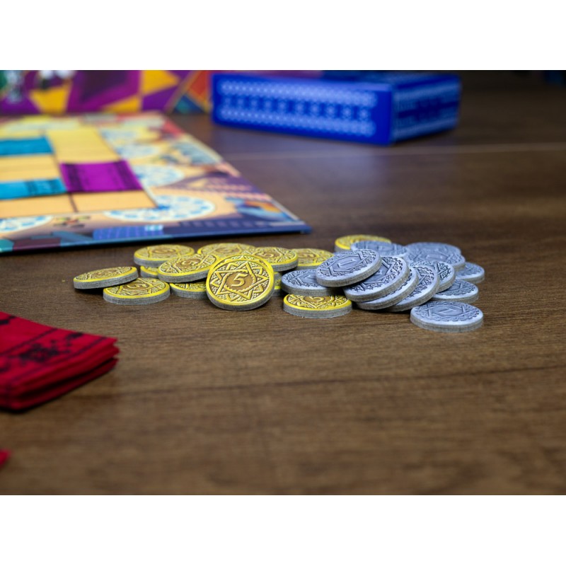 Cuando se coloca la última alfombra, se suma el número total de alfombras visibles y el número de monedas que posee cada jugador… ¡El mejor mercader gana!