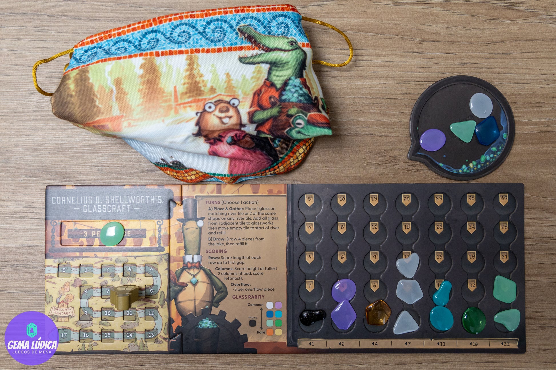 En River Valley Glassworks, juegas como uno de estos pioneros, extrayendo vidrio del mercado de fichas de río. Para ello, tienes que jugar una pieza de tu inventario en el río. Cada ficha de río solo puede tener una forma específica y debes jugar en un espacio adyacente al lugar desde el que quieres extraer. Después de recoger tu vidrio, el río avanza, revelando nuevas piezas y nuevas oportunidades.