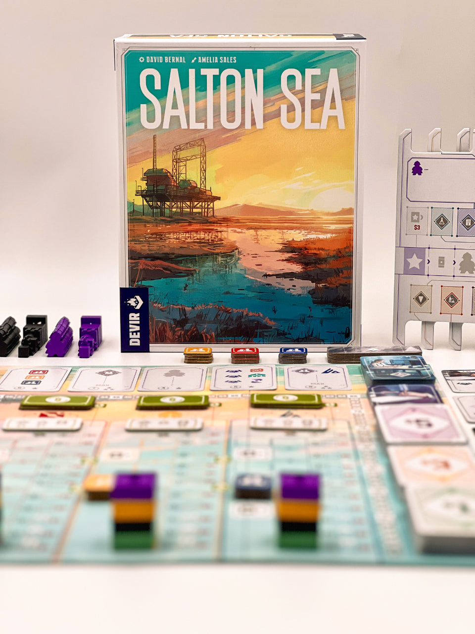 Obra de David Bernal e ilustrado por Amelia Sales, Salton Sea es un juego económico de colocación de trabajadores, gestión de recursos y toma de decisiones arriesgadas.