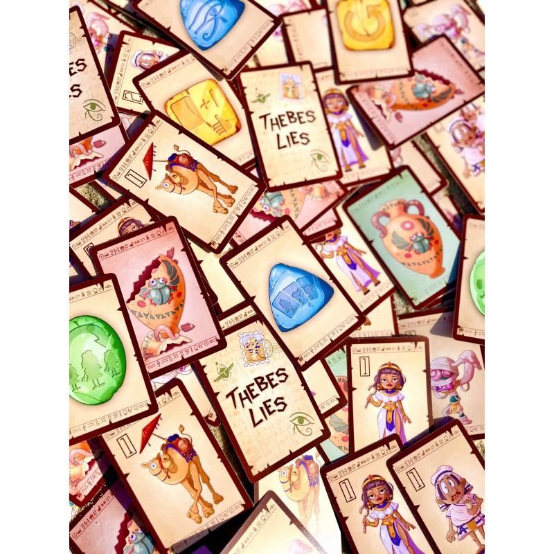 En Thebes Lies juegas un número incierto de rondas hasta que alguien obtiene 3 ánforas nuevas o 3 ánforas rotas. En ambos casos, el juego termina y habrá un ganador. Durante cada ronda, debes jugar tus cartas con astucia, ya sea engañando a tus oponentes o, si crees que están mintiendo, revelando las cartas jugadas y comprobándolas.